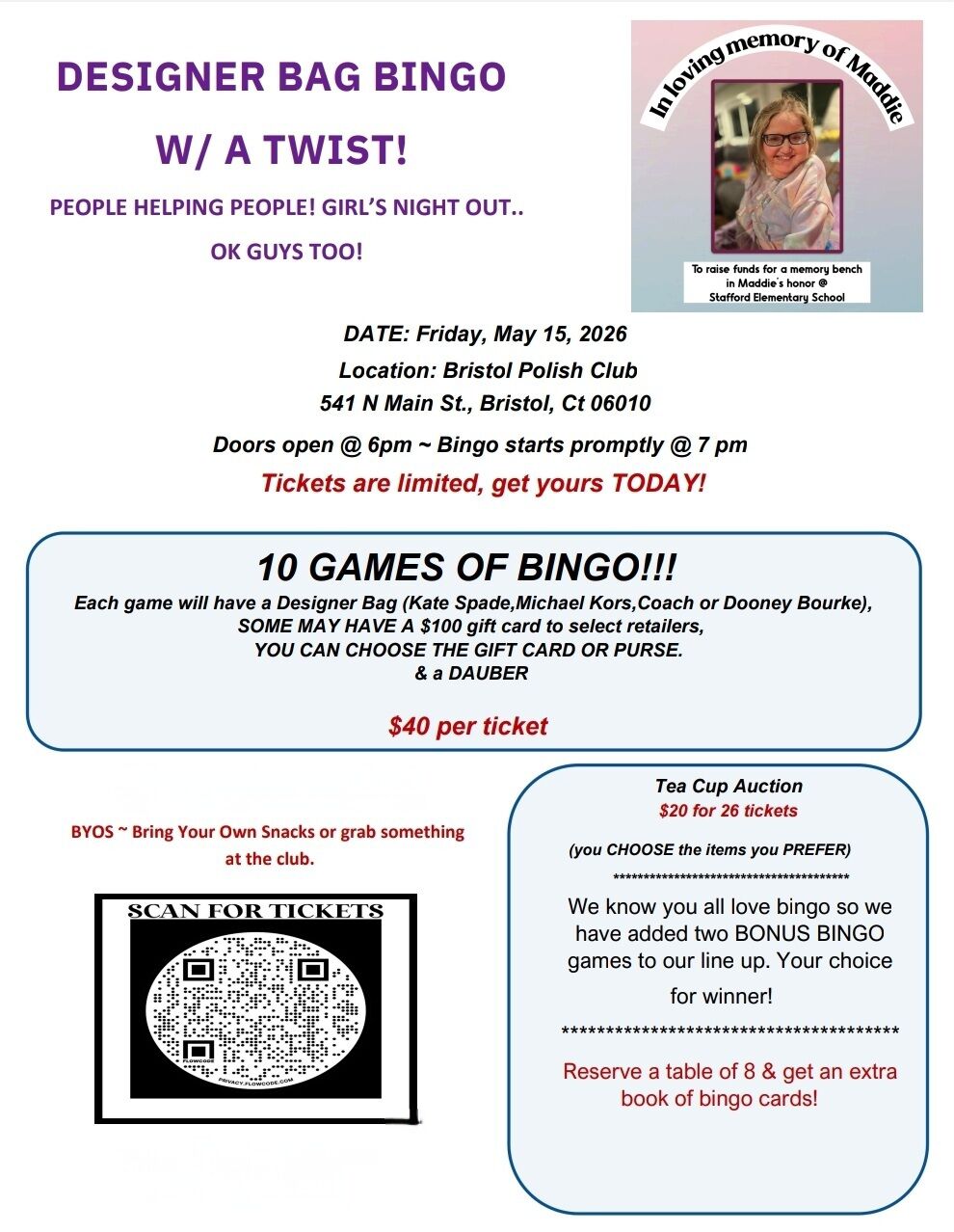 Hello Stafford Families! As many of you know, our very close knit Stafford community suffered the loss of student last year. Maddie B was known by everyone, and adored by all who knew her. We are raising funds to purchase a memorial bench to have at Stafford. If you are able to, please support our efforts and come for a fun night out of Designer Purse Bingo, and many raffles!! Please see the attached flyers for information.